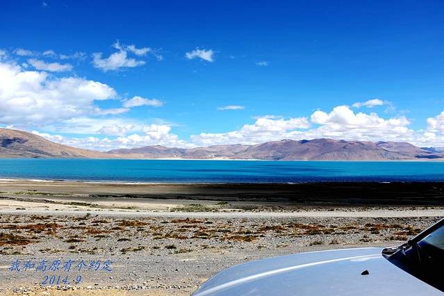 忽然看见前面有一台中巴车开下了公路,沿着一条便道向湖边驶去,心想这下好了,有了领航者,中巴能走的路我们自然不在话下,用对讲机呼叫路虎去“鬼湖”看看,可路虎已经跑出了呼叫范围,不管他们我们自己去。下道后才发现那条便道其实是干涸的湖滩,非常松软,稍不留神就可能陷车,只有紧跟着中巴车扬起的灰尘走才行,就这样小心跟着中巴车走到湖边,美丽神奇的“鬼湖”拉昂措展现在眼前。