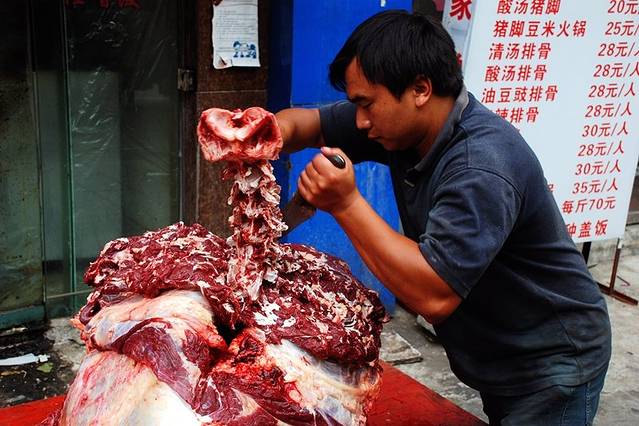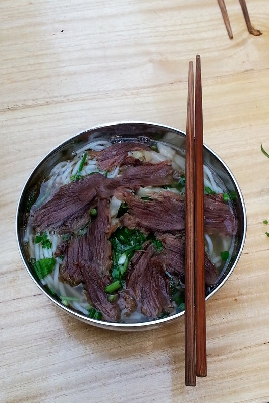 早餐在一家小店吃牛肉粉,这家门面很小的店却有着许多顾客,看来在当地小有名气。果不其然,做出的牛肉粉不仅份量足、味美,白白的米粉配上青菜和酱紫色的牛肉,吃着真是香香香。店老板在门口正在分解着一条刚刚买回来的牛肉,据店老板说这样一条牛也只要两天就可卖完,可见小店生意之好。看着他们那娴熟的动作,我脑子里忽然跳出了一句成语“庖丁解牛”,戏称他们为当代“庖丁”。