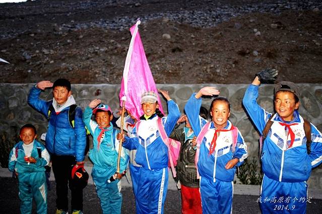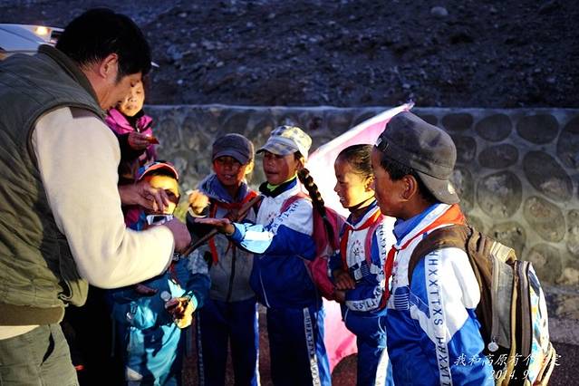 在海拔相对低的普兰睡了一晚很舒服,起来时天还没亮,简单地吃了碗泡面就出发了,阿里的早晨很冷,但我们还是放下了车窗呼吸着稀薄的空气。忽然间从车灯照射的尽头远远地看见有一支队伍向我们走来,近前一看是十几个孩子在一面旗帜的率领下去县城上学,见我们的到来,他们停下脚步一字排开向我们行队礼,那淳朴的样子不由让你眼眶一阵湿润,停下车来,将带来一路分发的学习用品和小食品全部给了他们,并鼓励他们好好学习,他们是西藏的未来。