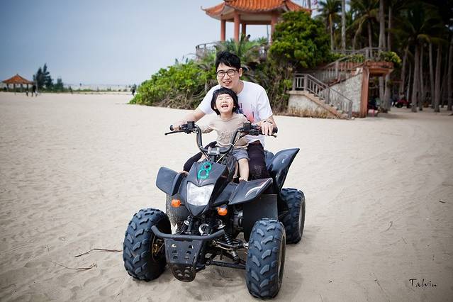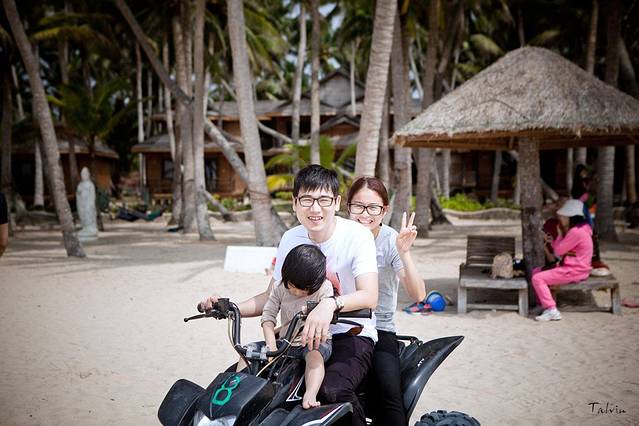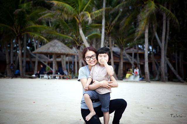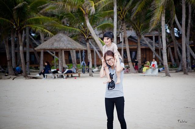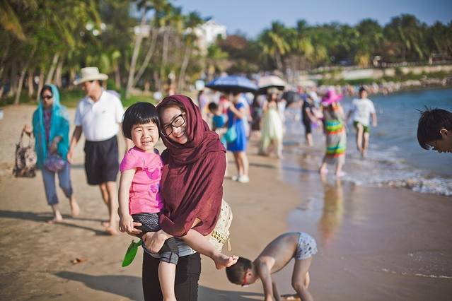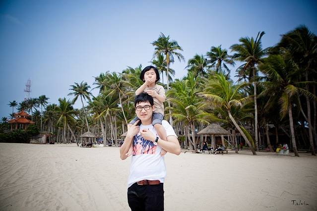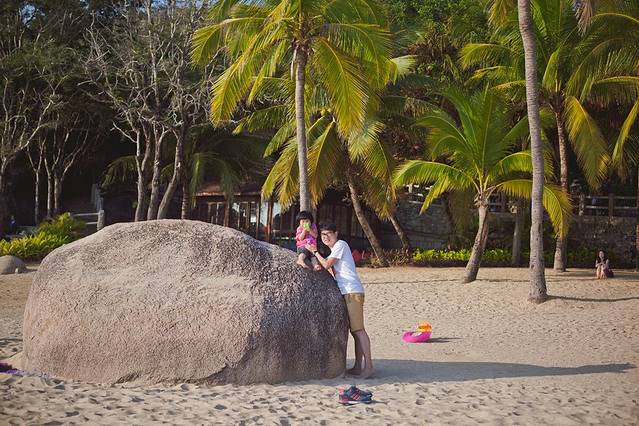 天涯海角距离凤凰机场非常近,在这里我们终于看到了海南春节旅游业昌盛景象,已经快下午5点的时间,还是能见到密密麻麻的旅游大巴。买票进景区,春节期间还门票还优惠了8元每人,景区正门的LED大屏不停地播放着今天游客接待的数量。进入景区,其实就是一道长远的海岸线,而在景区最里端就是享誉全球的两块石头“天涯”和“海角”,不过有一点不得不说,这里海水的清澈度真的很高,是文昌完全无法比拟的,海滩的沙质有点粗,光脚走在上面有点小疼。舅舅跟妮第一次来天涯海角,当然必须跟这两块名石排队合影,我们则带着Co姐在海边享受着海水的清凉。