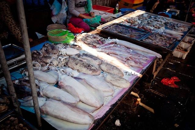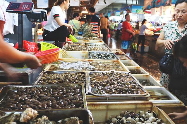 在第一市场吃海鲜可以先去市场买海鲜,然后到加工店里加工,当然也可以直接在店里点也可以。带着Co姐的我们当然要去市场里转转看看,店里的服务员美女欣然带着我们去市场买海鲜。