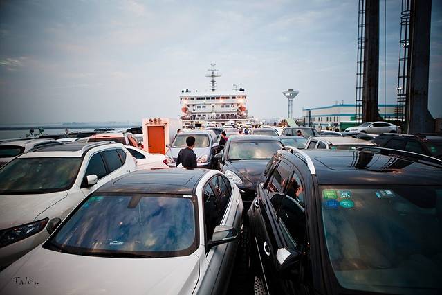 我们这次选择的摆渡码头是火车轮渡的北港码头,到达码头的时间已是下午5点半左右了,好在排队等候的车辆并不多。大约等候了半个小时我们就顺利登船了。摆渡船实行人车分离,乘客由岸边侯船厅上船,自由司机一人可以随车开到船上停车平台。停车时有专门的人员指挥,确保每辆车都在几公分的距离充分利用船上的每一寸空间。