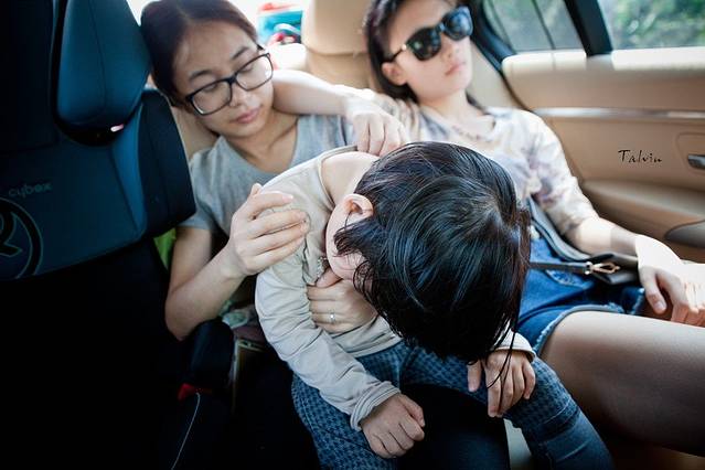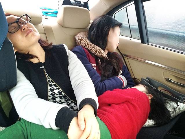 由于Co姐的安全座椅在,所以后排的空间并不充裕,Betty跟妮两个就是全程这样坐下来的,有时腿上还要睡个人