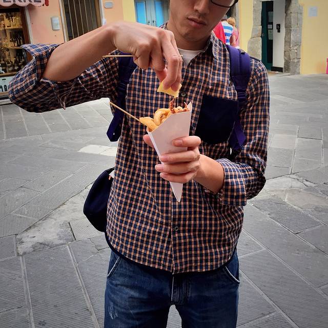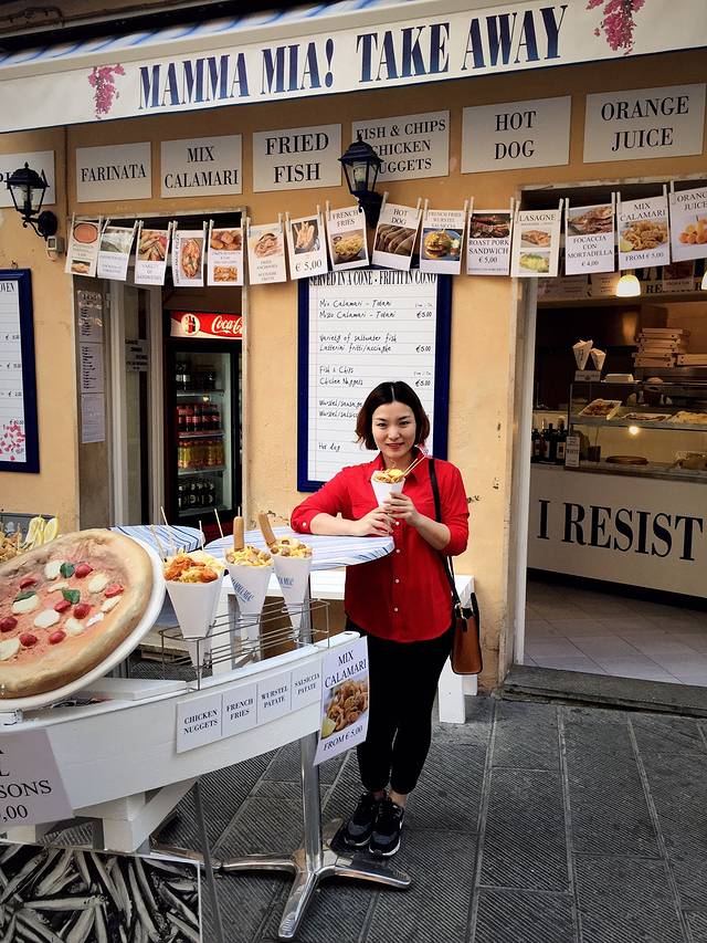 我们楼下就有一间吃这个炸海鲜的,我最爱吃鱿鱼!!现在看到照片都在吞口水呢,味道很赞,非常推荐!在瑞士玩后,来到意大利,瞬间觉得意大利的消费高低啊,什么都觉得很划算。