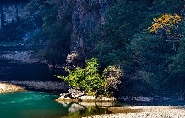 阳光在水流轻缓处的卵石河床上,柔化成粼粼的波光。