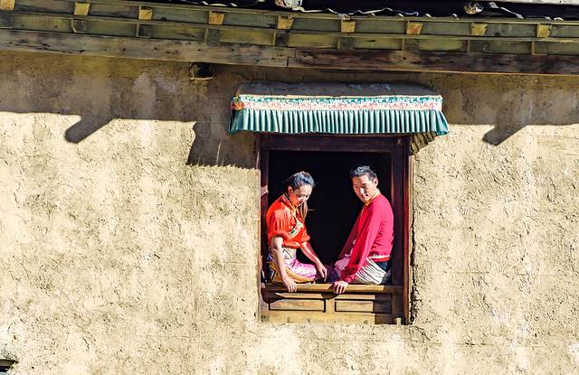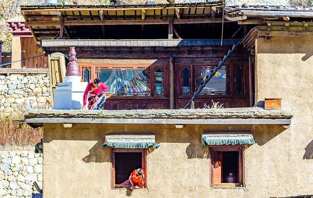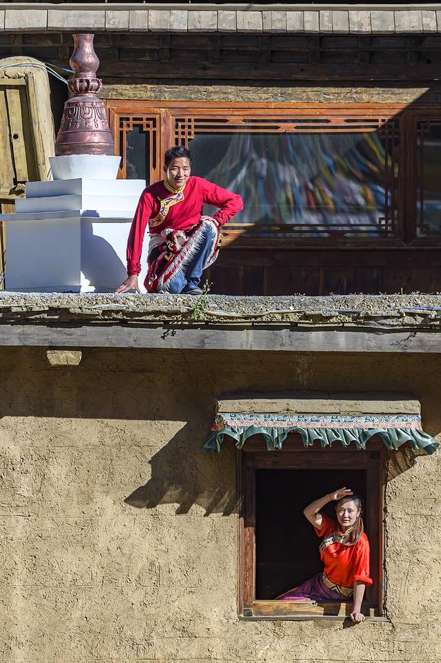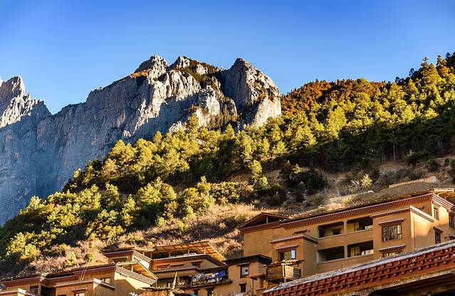 藏式木楼依山势层叠而建,多为二层或三四层的土墙碉楼式建筑,墙厚楼高,下层养牲畜,二层住人,三层为佛堂,屋顶为晒场。