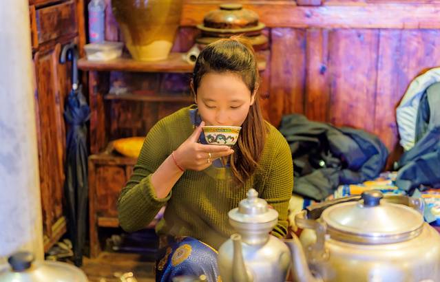 土房二层室中的火塘是炊饮之所,也是待客之处,家庭成员要按各自的位置就坐,客人有客人的座位。