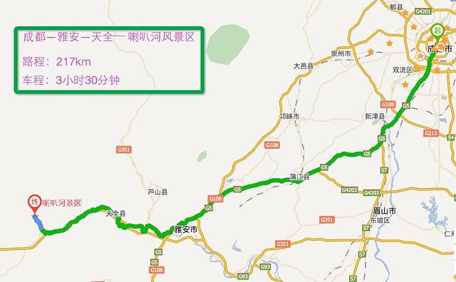 成都——雅安(成雅高速)——天全——喇叭河风景区