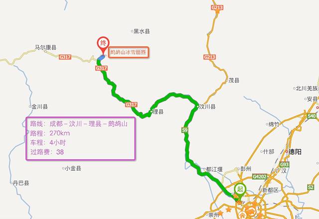 距离成都市区只有270公里的距离,从成都驱车出发,经成灌高速,都汶高速,然后沿着317国道开车4小时就可以抵达鹧鸪山了。