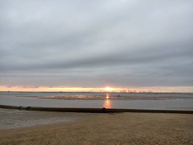 阴雨天的海边落日,虽云层浓厚,但也能看见落日黄昏。