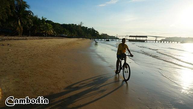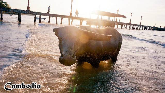 饱餐之后继续骑着摩托闲游,打算找一个海滩看日落,胜利海滩(Victory beach)据说是西哈努克日落最美的地方。海滩上没什么人,沙滩都是黑乎乎的细沙,海水不清也不蓝,有一段栈桥伸向海里,栈桥下发现一个石牛,都有些残缺了,不知道为什么被放在这里,这时候太阳还高,夕阳美景好像还距离我很遥远。远远的在日落的方向望见一座桥,无聊的我们想去桥上看夕阳,就一路向着太阳奔去,到了桥头是封闭着的,这竟然是座新建成还未投入使用的桥。我们只能到桥附近找个野沙滩,这时候太阳依然泛着金辉悬挂在海面之上,可是晚上还要坐大巴去暹粒,没有时间等着看它一点点落下,在回旅馆的路上,天边火红的晚霞一路追随着我们。前几分钟我们在追日,现在是晚霞追着我们。