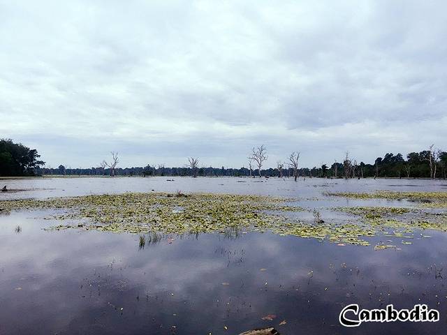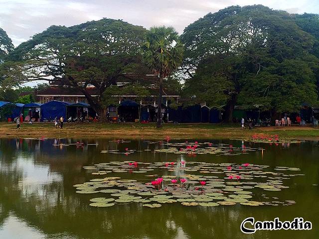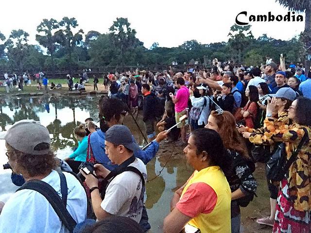 我怀着激动的心一夜都没睡好,四点钟就起来准备,五点出发去迎接日出。路南只有水塘没有荷花,人不多,路北早早挤满了人,为了选择一个最佳拍摄的位置大家都蛮拼的,人群里三层外三层,我就算拿着自拍杆伸出去也拍不到最好的画面啊,发现一些人站在水里,很多人穿着运动鞋不敢下水,我穿了拖鞋,果断挽起裤脚,拨开人群走进荷塘,背后一个同胞说:这大姐够为艺术献身啊!站在水里的都是高手啊,一看设备都专业的不要不要的,我拿着小微单凑过去就有个老外嚷着:Be careful!我的设备很昂贵!NND,无心和她吵,我忍下这口气,只想静静的等候日出。开始有一抹淡淡的红出现在三塔后面,所有人此刻都安静的虔诚的等候,耳边只有快门声此起彼伏的响起。期待着那红色会鲜艳起来,蔓延开来,可是它却逐渐暗淡下去,没有奇迹发生,天就这么亮了,一次失败的日出开启我第一天的吴哥之旅,多少有些遗憾!