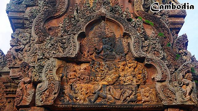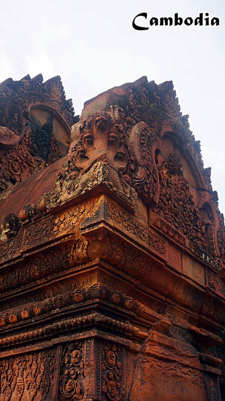 女王宫是一座红色砂岩建造的小巧精致的寺庙,色彩艳丽,浮雕复杂细腻,就连很小的细节都处理的让人震惊,一朵朵浪花都是立体的,门柱底下的小佛像的发丝和手指都清晰可见。不得不感叹古人究竟拥有怎样高超的技艺啊!这回我知道为什么蒋勋老师会17次来到这里,这里精致,精美,让我无法用言语表达。我们来得很早,还没有什么游客,可以安静的慢慢欣赏每一处细节,这里的每一个门楣都雕刻着不同的故事,精美生动,我们用有限的知识解读着这些故事,哪一个是比湿努神,哪一个是湿婆神......这个早晨,我们在这片艳丽的古迹中迷失了自己。