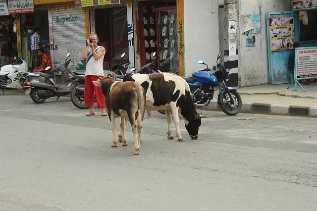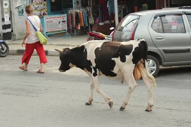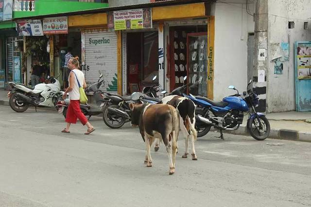 尼泊尔的牛被当地人当神一样的看待,低位远远高于其他的家畜。理所当然,牛上街也不在话下了。所以你在尼泊尔会经常看到这样一个场面,一排轿车都停下等一群牛过马路。