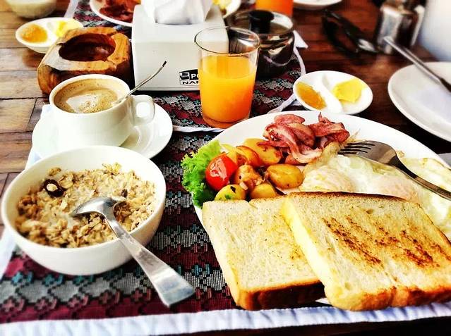 尼泊尔的西餐还对于其他菜系算是便宜的,图片是一个早餐的套餐,有一杯咖啡,一杯橙汁,炒土豆块,培根,两块吐司,一块煎鸡蛋,一碗燕麦。加起来一共10几人民币。就相当于国内一碗牛肉面加两块卤干子的价格。