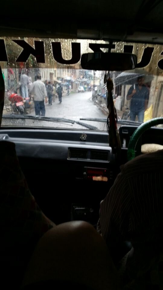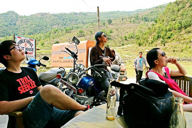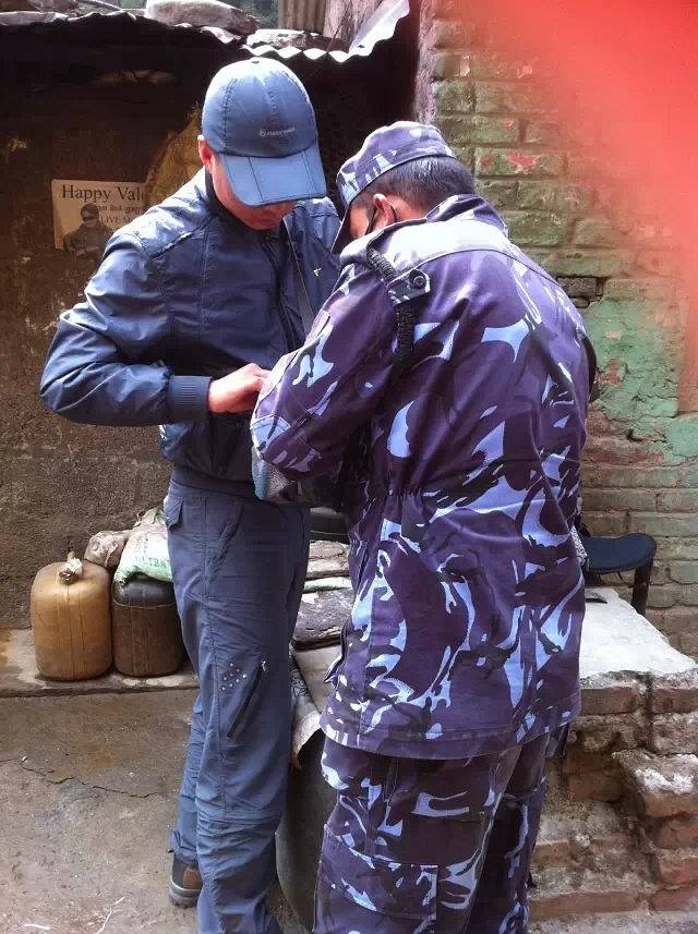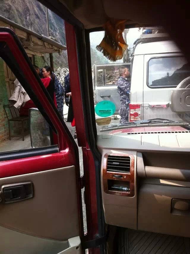 偷拍的,一名尼泊尔士兵正在搜我们一个朋友的身呢。太过分了。一路颠簸一路风尘仆仆的做在车上,越野车一直在山间盘旋,透过窗户可以看到尼泊尔人民的房屋建筑还有山间蹦极啊。不得不佩服尼泊尔人民的建房技术,房子好多都建在悬崖上。