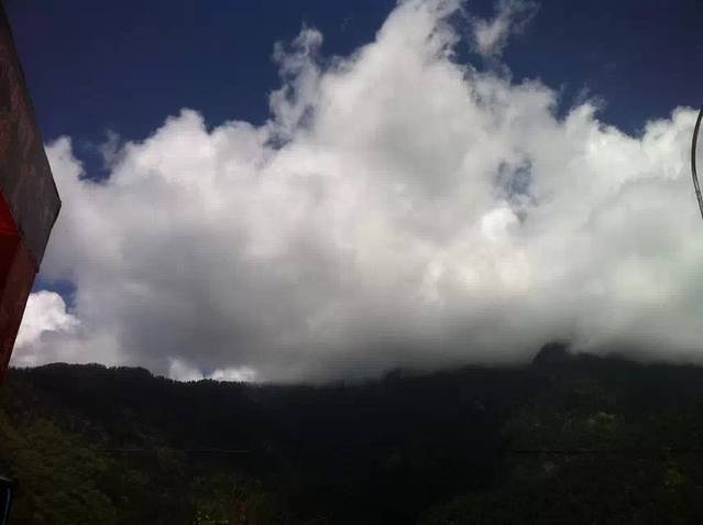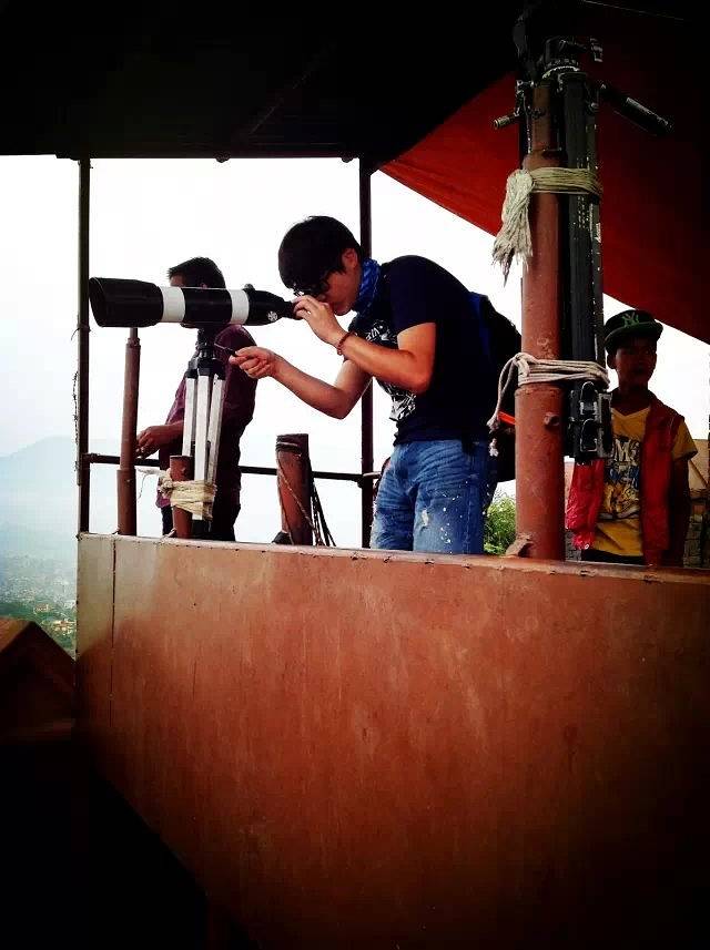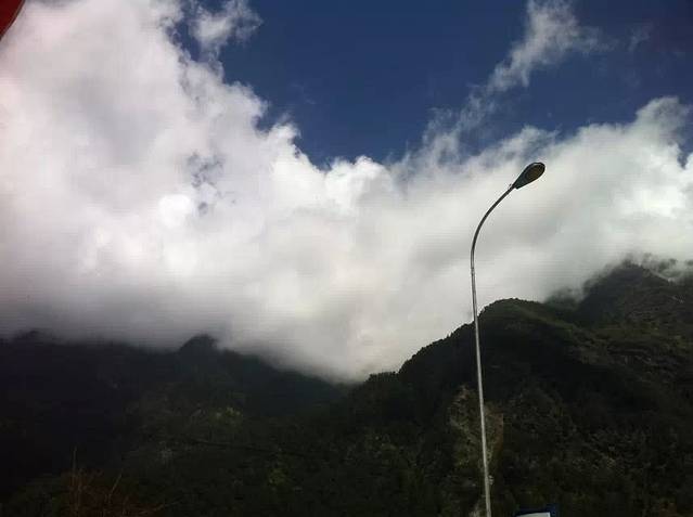 一路艰难的骑车接近山顶,由于和平塔要走楼梯步行上去,所以车停在了半山腰。我们一行人终于在日落之前赶上了山顶。天有不测风云啊,刚到山顶就看到山对面乌云密布,不一会对面的山头已经开始下雨。乌云也在往我们这边漂。这会下山也来不及了,肯定会在下山的途中下雨。那时候骑车肯定更危险。但是山顶不是招雷劈也危险吗,我们就临时决定看附件有没避雨的地方,临时避下。