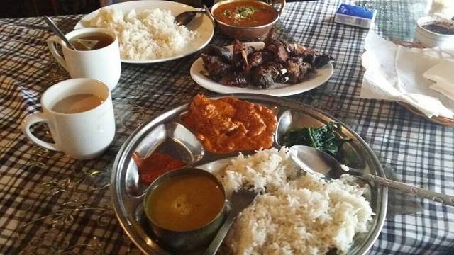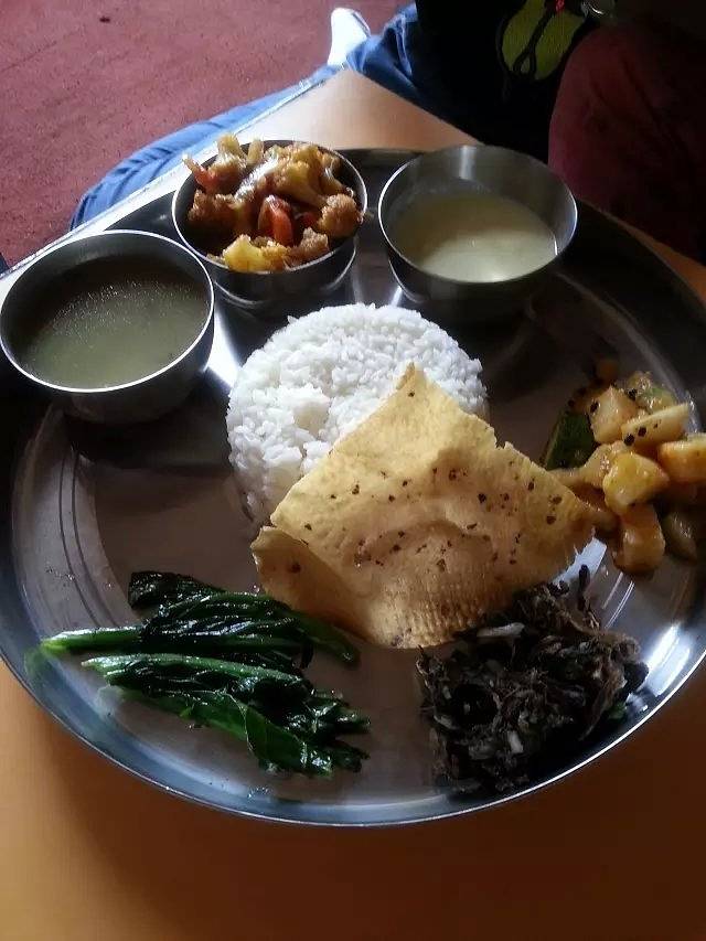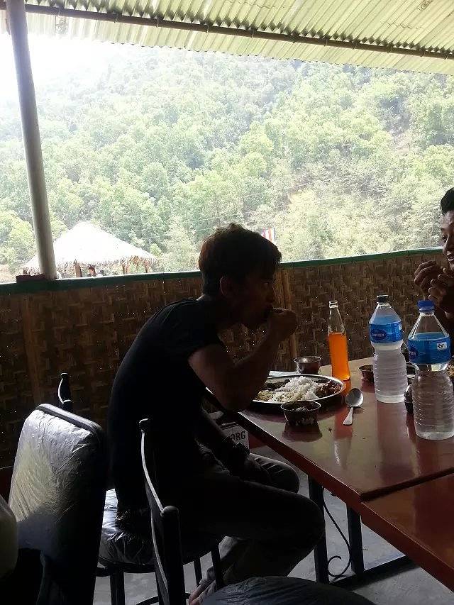 由于到了中午,司机在一个尼泊尔当地的一个路边餐厅停了车,给我们说是路程还有2个小时,让我们先吃饭再坐车。吃的标准的尼泊尔餐,价格忘记了,反正不贵。味道能接受,你吃饭的途中还会有小哥拿着一大碗饭过来问你加不加。服务还不错。短暂吃完饭后又继续上路了。接下来又是一路颠簸。