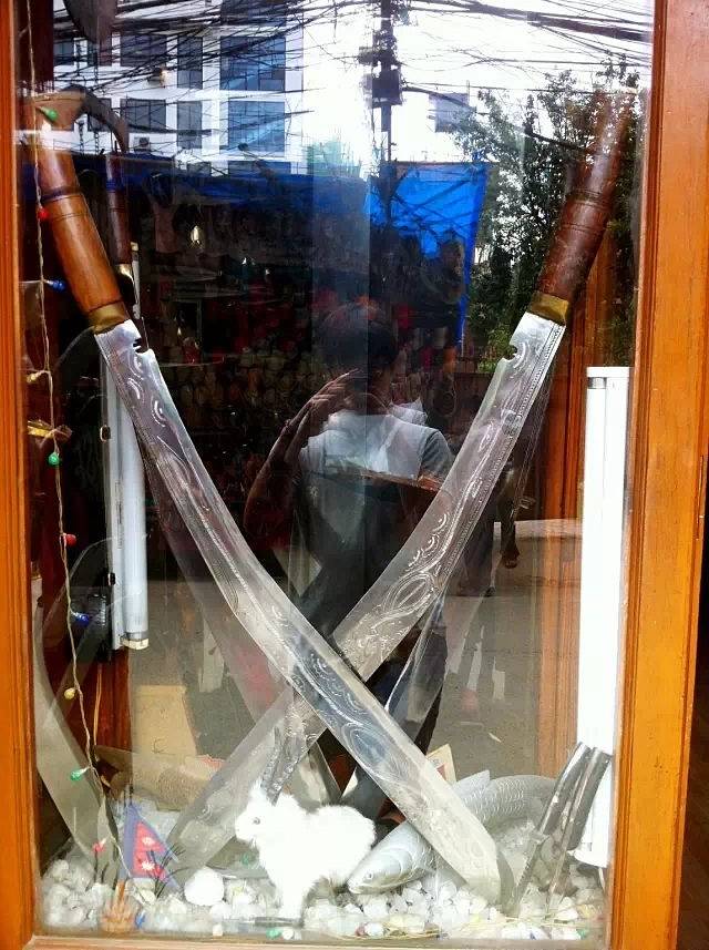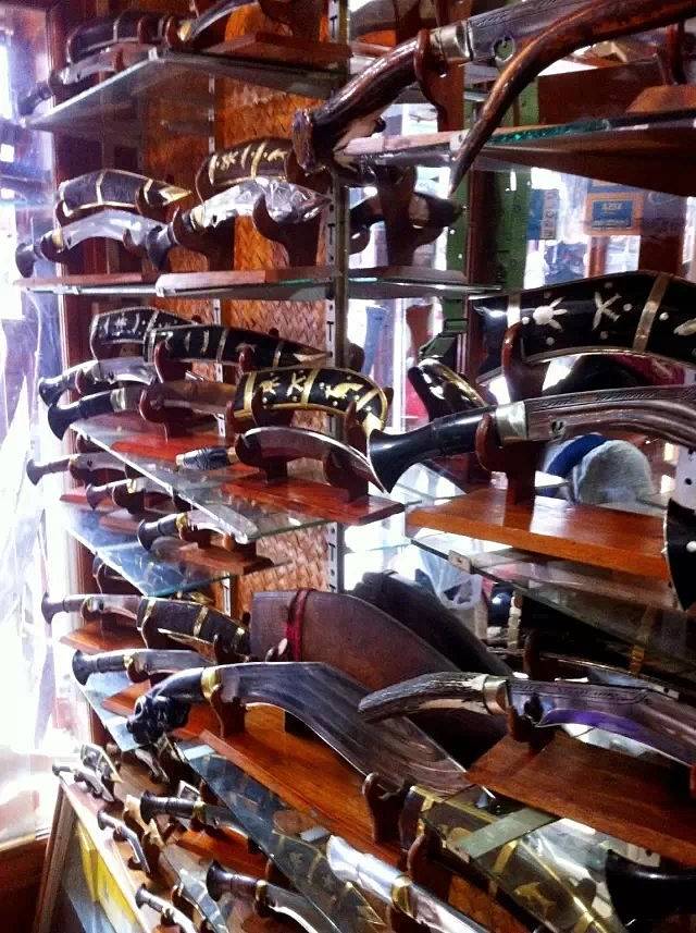 著名的尼泊尔军刀店,刀的价格由低到高不等。当时准备买把带回国耍耍的,但是国内由于发生了恐怖事件对于管制刀具控制的非常严。这个想法只能胎死腹中了。