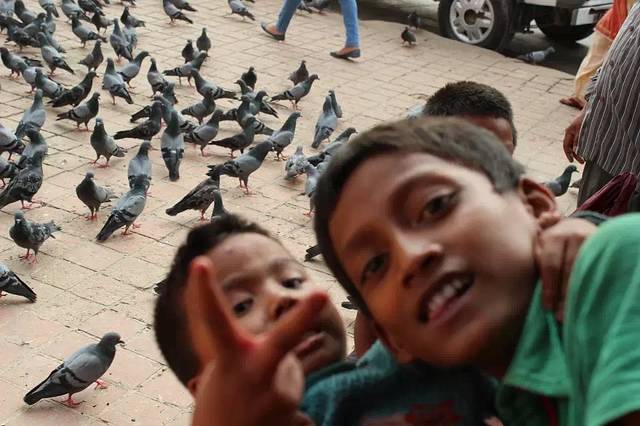 我给了一点士力架他们,几个小孩非常可爱,抢着吃,追着打闹。后来回来了一个小孩还拿来了喂鸽子的食料送给我,礼尚往来吧。当我给他们提出照相时,也很配合的摆出POSE。
