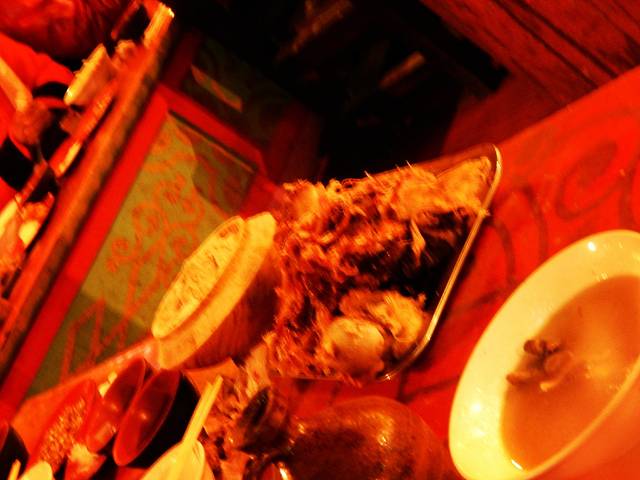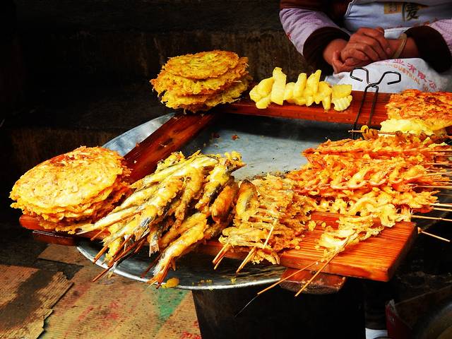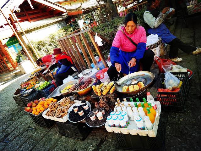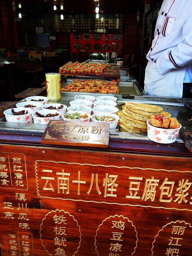 在古城吃了传说中最著名的过桥米线,我只能呵呵,比较我这个辣妹子吃不惯饭菜里没有一点辣椒的食物,这边的吃食物价偏高,建议最好不要在古城里吃午饭,离古城很久的忠义市场和昭庆市场都是不错的选择,当地最出名的除了过桥米线,还有腊排骨,必吃!随便找一家坐下就行人均消费30。古城里的小吃很多什么纳西米糕啊香肠啊,应有尽有,老婆婆卖的小吃大概每样的价格都是5块左右,分量就只有呵呵了。如果是古城店铺里面的小吃价格25左右,味道真的so一般,毕竟这里是消费中心啊,物价自然是便宜不了的。