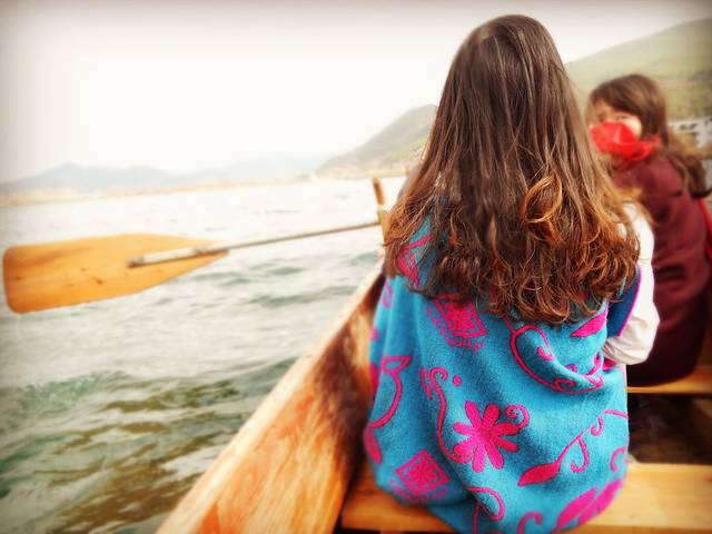 坐船游览泸沽湖,我们在摩挲族姑娘的带领的节奏下滑动手中的船桨,感受在泸沽湖游船的乐趣。但是由于天气真的很不好,船在湖中心被风吹得摇摇晃晃,摩梭族的姑娘建议我们还是赶紧回头,好遗憾没有到达对面。