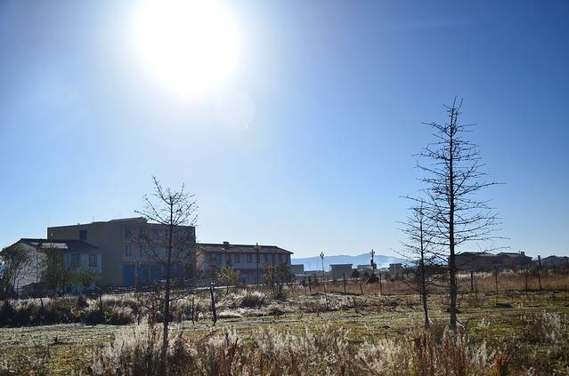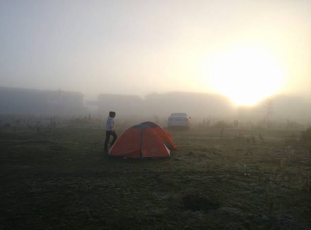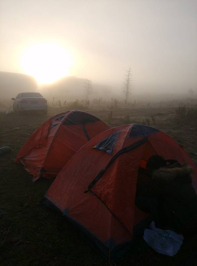 次日醒来,外面温度很低。车挡风玻璃上有了很厚一层冰。远处很大的雾,让升起的太阳光芒都有种冲不破的感觉。
