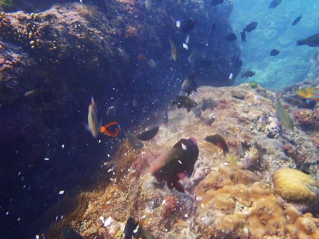 在游到一个区域时,教练塞给我们一些土司,让我们在海里给鱼喂食,立刻就有许多鱼游了过来,我甚至还碰到了一条滑溜溜的鱼。教练一个猛子扎进海底深处,在底下四五米的距离给我们在海底拍照,我觉得他简直是比一群鱼还要酷炫拽呢。