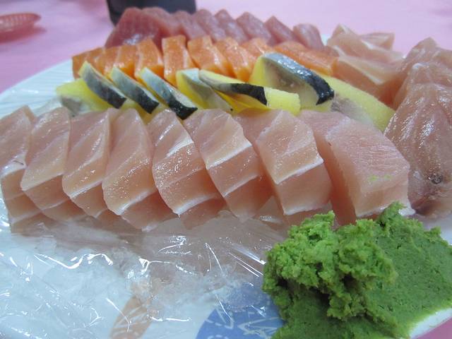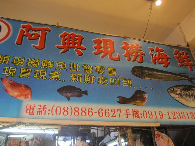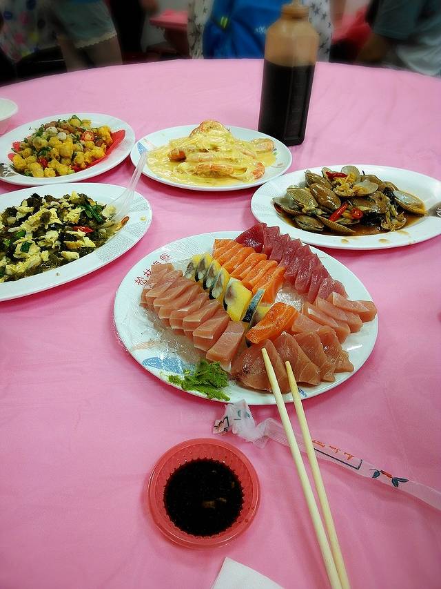 和Jerry联系后,他在门口把我们接上车开去后壁湖渔港吃海鲜,比起馆子店吃东西,当然是在渔港吃要更新鲜和划算。进了渔港到阿兴家,我们点了虾啊螃蟹啊章鱼嘴啊和最实惠的代表——生鱼片拼盘。我妈可爱吃生鱼片了,一盘那么厚那么多才200台币,妈妈一直夸说很便宜。