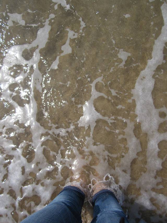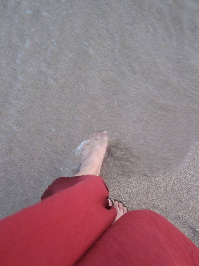 这次下到沙滩有了经验,早早把鞋子袜子脱好放在了离海边很远的距离,将裤脚卷到最高,欢快投入了被夕阳染成金红色的南湾中。