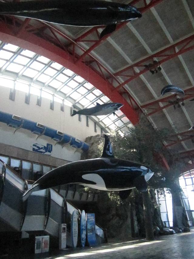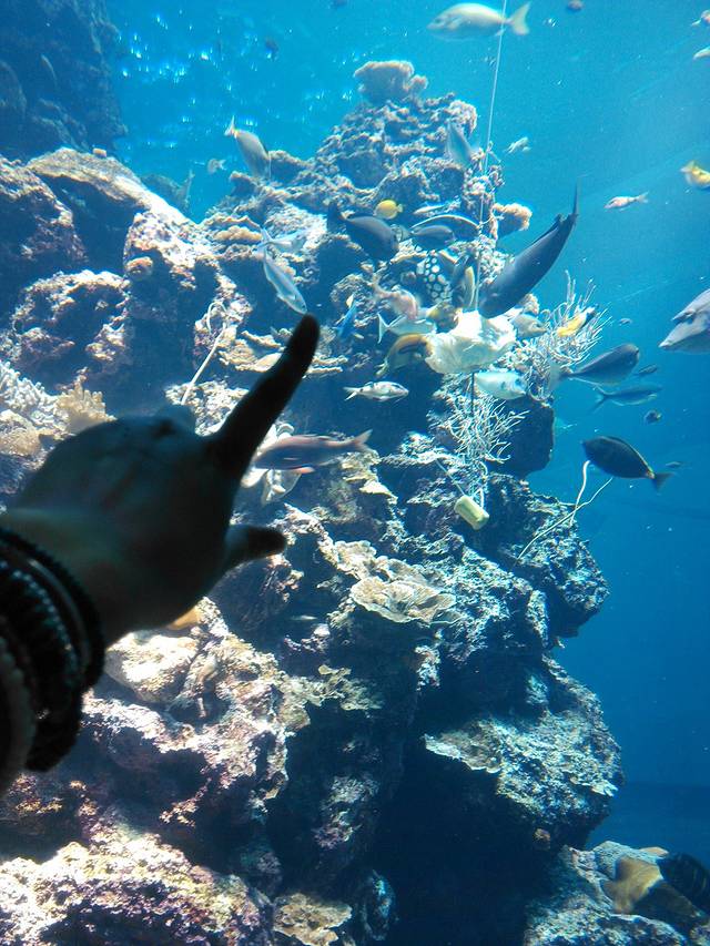 进到里边就看见了挂在上边的一堆按照海洋生物比例做的模型,对比起来感觉人类在海洋生物面前还真是渺小得可怜。走了没多久,我就看到了一缸缸的透明水池,里边是珊瑚礁石和各种颜色鲜艳的鱼类,眼花缭乱简直看不过来。