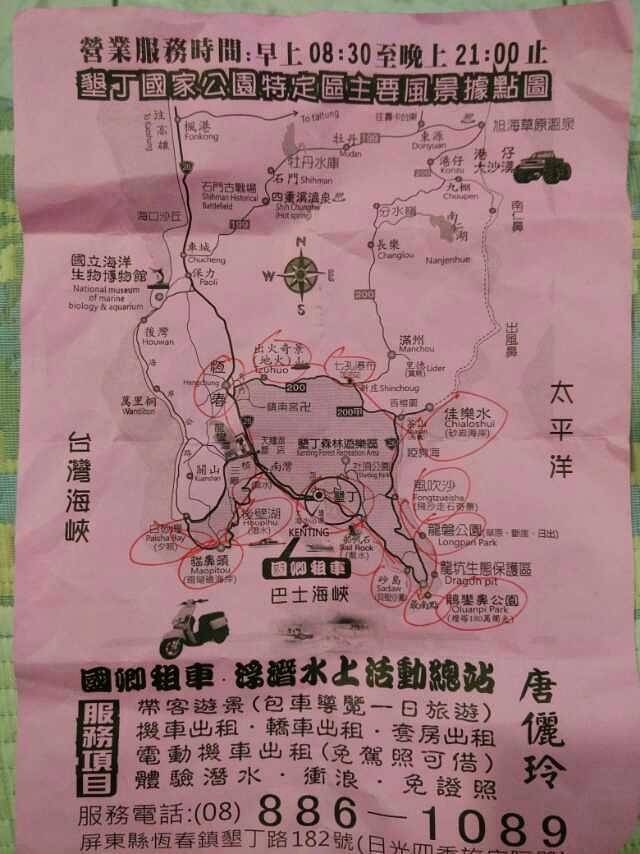 租电动车→到垦丁国家公园管理处听简报→船帆石→砂岛→鹅銮鼻公园→龙坑→龙磐公园→风吹沙→佳乐水→恒春古镇→南湾→民宿送的牛肉面套餐→垦丁夜市