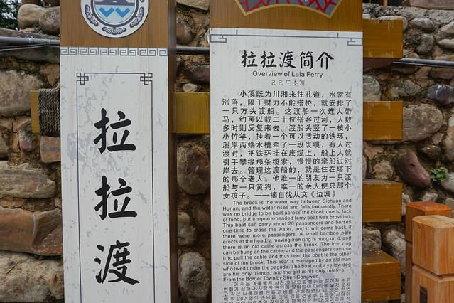 《边城》里面是这样描述拉拉渡的:“小溪既为川湘来往孔道,水常有涨落,限于财力不能搭桥,就安排了一只方头渡船。这渡船一次连人带马,约可以载二十位搭客过河,人数多时则反复来去。渡船头竖了一只小竹竿,挂着一个可以活动的小铁环,溪岸两端水槽牵了一段废缆,有人过渡时,把铁环挂在废缆上,船上人就引手攀缘那条缆索,慢慢的牵船过对岸去。”