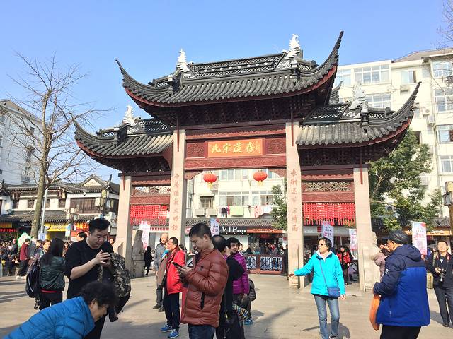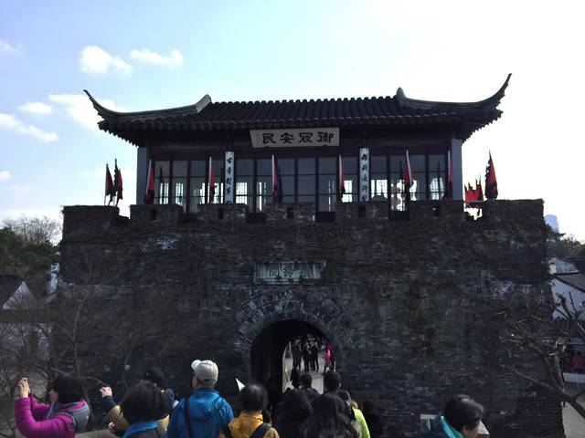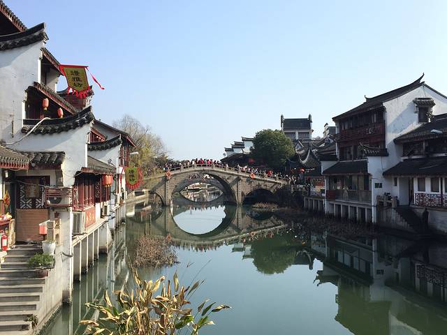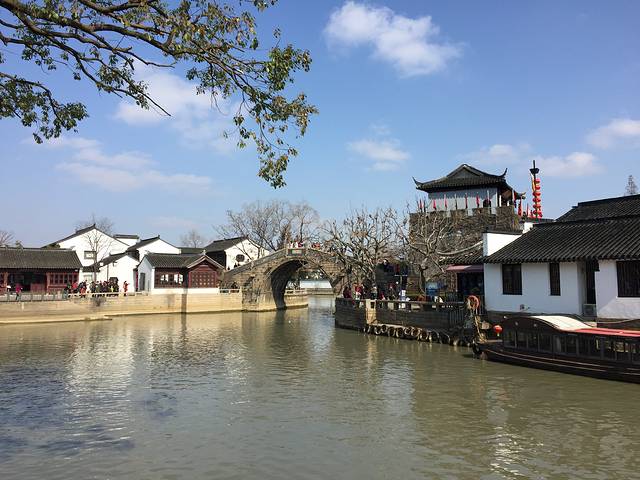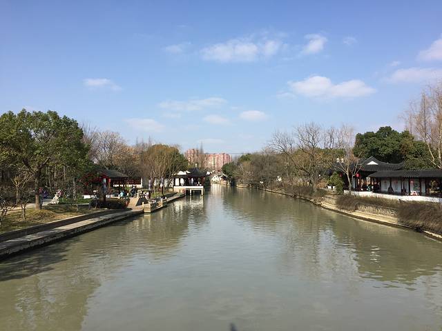 从寒山寺出来,走过一条小桥就到了枫桥景区的入口,给入口的工作人员看了下手机上的短信验证码,我们就顺利进去了。枫桥比起寒山寺要清静得多,地方很大,建筑也没那么密集,在这里散步十分惬意舒适,完全满足了我们对江南水乡的想象。我们去的这天天气不错,拿手机随处一拍都是一道亮丽的风景。景区有游船项目,不过我们没什么兴趣,所以不知道价钱,去玩的人还是挺多的,远远可以看到很多人排队。