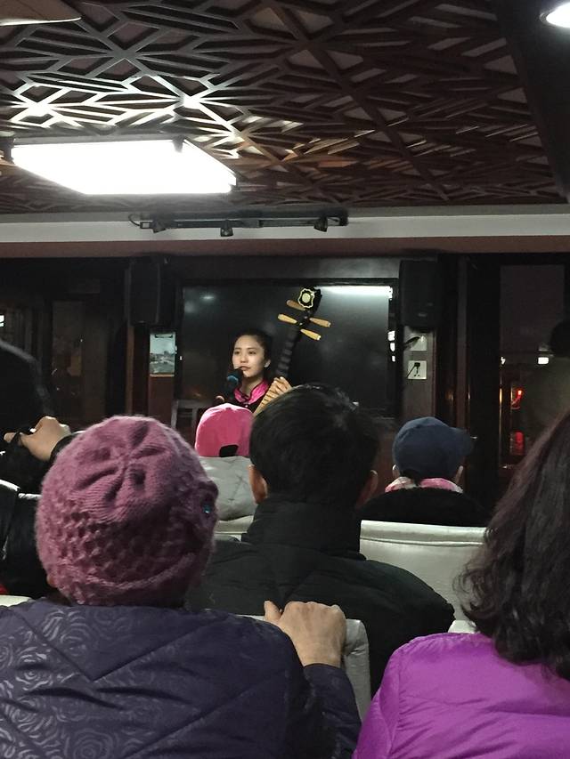 码头上的指示是写着六点半开始游船,我们傻乎乎的到处找地方歇脚冻得缩成一团。后来才知道原来到码头那边排队,船坐满了就可以开了,不用等到六点半。不过也幸亏我们多等了一段时间,排队到我们的时候天刚好全黑了,运河两岸的古建筑都亮起了灯,这才是游船的价值所在。游船还算舒适,一艘船上有一位导游姐姐和两个大叔,游船会在每段运河上来回走一遍,让船两边的游客都能看到两岸的景色。导游姐姐不仅讲解了许多苏州的历史和桥梁的故事,还给我们弹了琵琶唱了苏州的民歌,这游船的票钱光是给这位姐姐也是值回票价了。