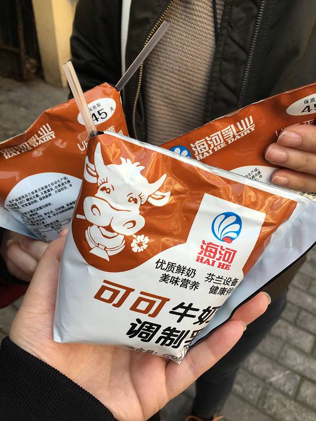 在丰裕生煎的对面有一家牛奶店,我们喝到了微博上好多人推荐的海河巧克力牛奶,味道跟广州的燕塘还有点像呢~