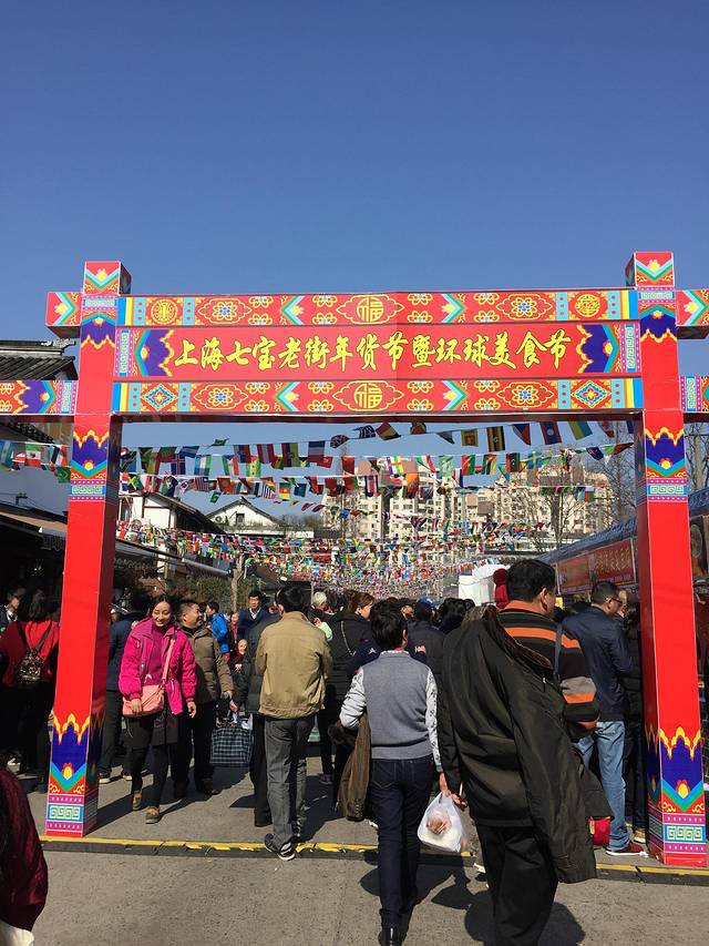 吃完早餐,我们就火急火燎地来到了七宝古镇。坐地铁9号线到七宝站,走一段路就可以看到七宝老街。我们到的时候入口的人还不算多,本来以为会有昨天在影视乐园的好运气,谁知道一走进古镇的巷子里,人头涌涌,大伙儿都是被推着走的,旁边的巷道里还不时飘来阵阵烤羊肉串的烟,熏得人捂着鼻子直咳嗽。好不容易走过了巷子,小桥边上也是挤满了游客,围着各种小吃摊档转悠,手上不拿着点吃的好像都不像回事。