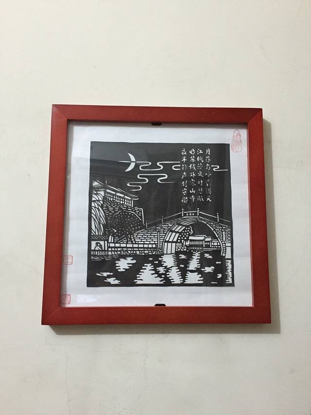 枫桥景区的一条小街里有各种民俗工艺品的商铺,在那里的剪纸店让我很是着迷。最后我买了两幅剪纸,一张虎丘、一张枫桥,用相框裱起来后特别有艺术感。