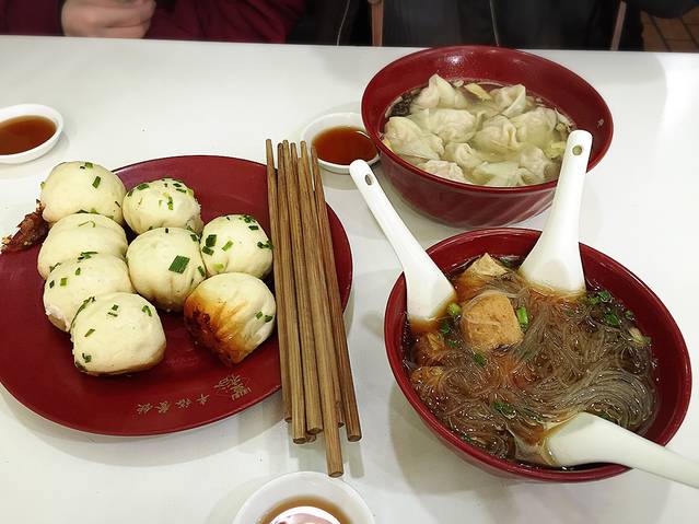 昨天的早餐在M记凑合了一下,今天我们下定决心要找正宗的上海早餐饱饱口福!还好在大众点评找到了这家还开门的丰裕生煎,而且就在地铁站附近。店里的装潢十分朴素,一看就是有点年头的老店。进门处就有收银台和菜单,点好东西以后要自己拿着单子去相应的窗口排队等。我们去的时候人有点多,幸好还有空桌。经过昨天在南翔馒头店的一顿,我们本来以为这里也要花不少钱,没想到价格是出奇的实惠,生煎6块4个,馄饨和粉丝汤都是8块,加起来我们的这顿早餐才28。想到昨天35块一个的灌汤包,我们心里流下来感激的泪水。