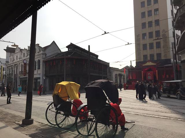 红色的舞台那里时不时有演出活动,近处这两辆黄包车好像是供给游客拍照的,5块钱一次。