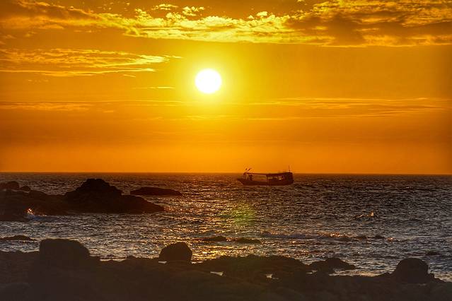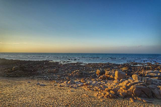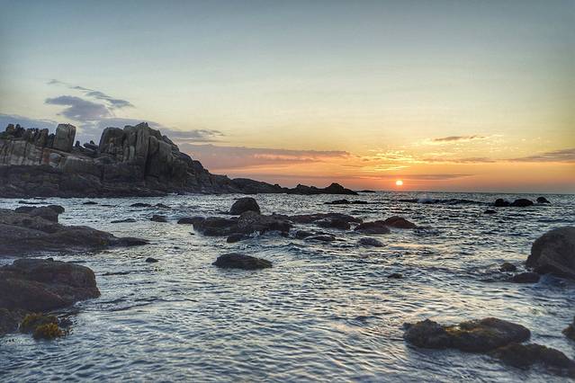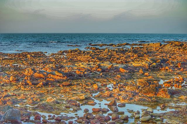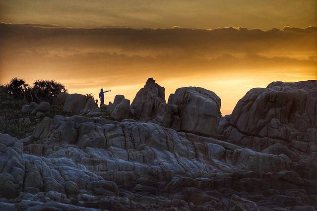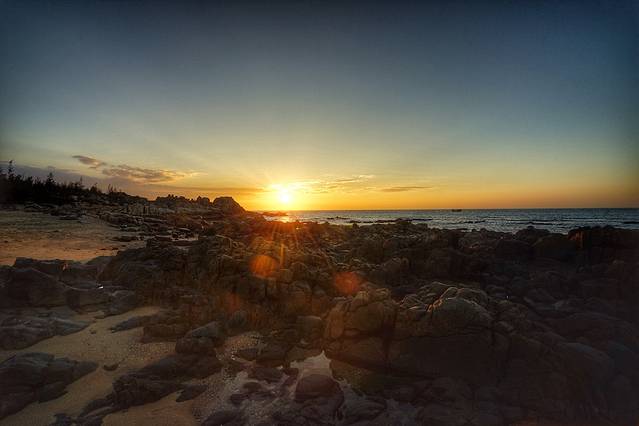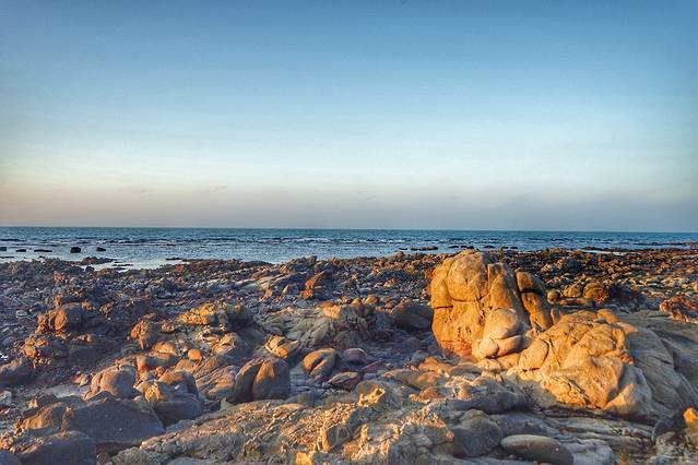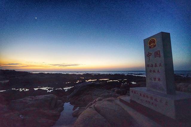 此行重点推荐的景点,昌江峻壁角。峻壁角其实是棋子湾海滨的重要组成部分,海岸线呈东北西南走向长约四公里的海湾。峻壁角的海湾几乎全是礁石和珊瑚残骸堆积的沙石湾,每当退潮后,海边密布着一望无际的礁石,是非常奇特而原始的天然海岸地貌景观,这里的日落非常完美。在海湾的一边静静地矗立着中国领海基准方位点的石碑。