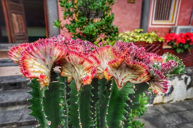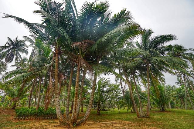 这种分叉的椰子树第一次来海南,就在东郊椰林的一个很山寨,但很好玩的椰子公园看到过,说是椰树王,这里又说是椰妖。其实就是变异的椰子树,因为正常的椰子树是无分枝的,但是控制花序发育的基因发生突变时导致花序变异发育为侧枝,侧枝虽然不能正常开花结果,但是形态特异,这种变异极为罕见,很具观赏价值。