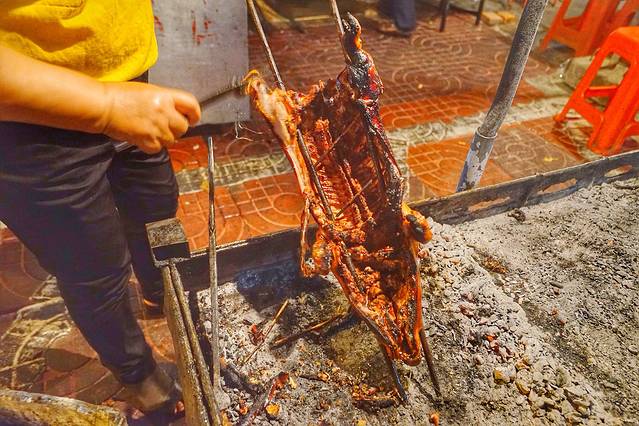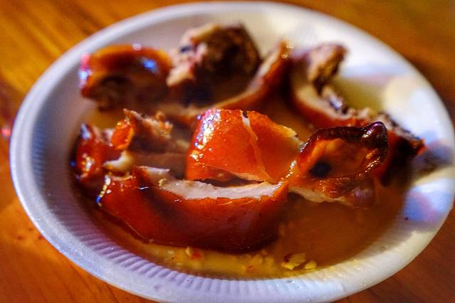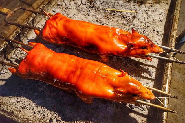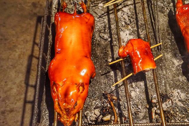 自驾车会路过很多地方,每个地方都有自己的名菜。东方的四更烤乳猪名不虚传,这里有一条街都是卖烤乳猪的,每斤90元,价格不便宜,但是皮脆、肉嫩、骨酥,吃起来满口余香,味道真是不错。这种猪体小腰直,皮薄肉瘦,养到30天左右即可出栏,每只差不多四五斤。