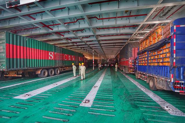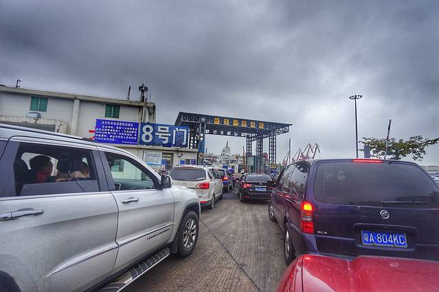 离岛坐轮渡的小车比来的时候要多,排了一会儿队,但时间不算长。