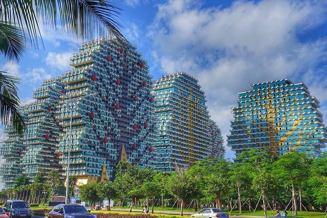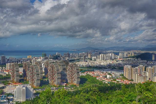 临春岭就在三亚大树公馆旁边,从这里可以清晰地看见大树公馆的几栋奇葩大楼。