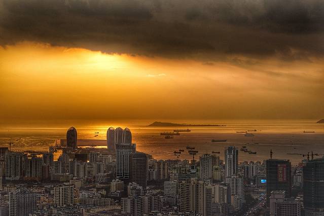 还没有到日落的时候,躲在云彩后面的太阳就开始发力了,三亚湾在夕阳的照射下一片金黄。