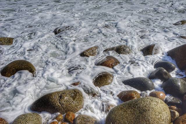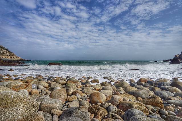 这里的特点就是没有沙滩,岸上遍布密密麻麻的卵石,有圆有扁,大的如斗小的如蛋。弓状的卵石滩上,大小石块你拥我挤地堆积在一起,看似稳固,实则松动,在上面行走还真是要加点小心。