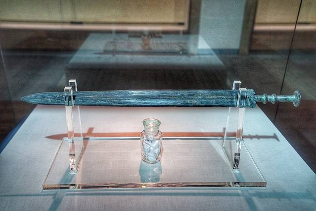 镇馆三宝之一:战国越王亓北古错金铭文青铜复合剑。越王剑是中国古代兵器史中的极品,这柄越王剑是越王勾践之孙越王亓北古所使用的佩剑。此剑已有2400多年的历史,剑身依然保存完好,坚韧锋利如初。这种青铜复合剑采用了难度极高的嵌铸技术,使得剑中脊韧性高不容易折断,而剑两丛硬度高,可提高实战中的杀伤力。