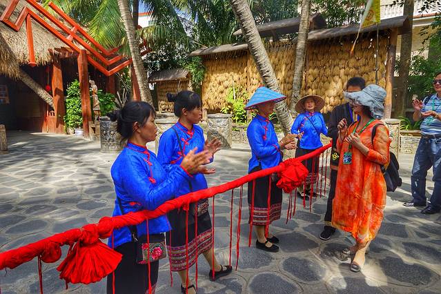 黎族人民男女老少都爱唱歌,黎族民歌浑厚朴实、琅琅上口,散发着浓郁乡土气息。每个旅行团的游客必须派个代表出来唱歌,唱得好才能过去。