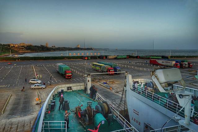 上次由于到得太晚,汽车轮渡抵达海口已经是凌晨了。这次吸取了经验,天黑前就到了海口。算了一下,轮渡航行至少2个小时,等候时间1-2小时,也就是说最顺利的话渡海也要3个多小时,一般来说4个小时左右。这次来感觉海安港码头的指示牌更加清楚了,大车小车分得很清楚,大车要排队,小车道基本上就是空的。